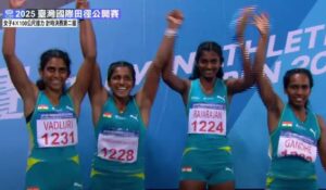 भारत की महिला 4×100 मीटर रिले टीम ने ताइवान एथलेटिक्स ओपन 2025 में शानदार प्रदर्शन करते हुए स्वर्ण पदक जीत लिया। टीम ने केवल 44.07 सेकंड में रेस पूरी कर न सिर्फ पहला स्थान हासिल किया, बल्कि चैंपियनशिप रिकॉर्ड भी बना दिया। विजेता टीम में वी. सुधीक्षा, अभिनया राजराजन, एस. एस. स्नेहा और नित्या गांधी शामिल थीं। चारों धाविकाओं ने बेहतरीन तालमेल और तेज़ गति के साथ रेस पूरी की और एशिया की टॉप टीमों को पीछे छोड़ दिया।