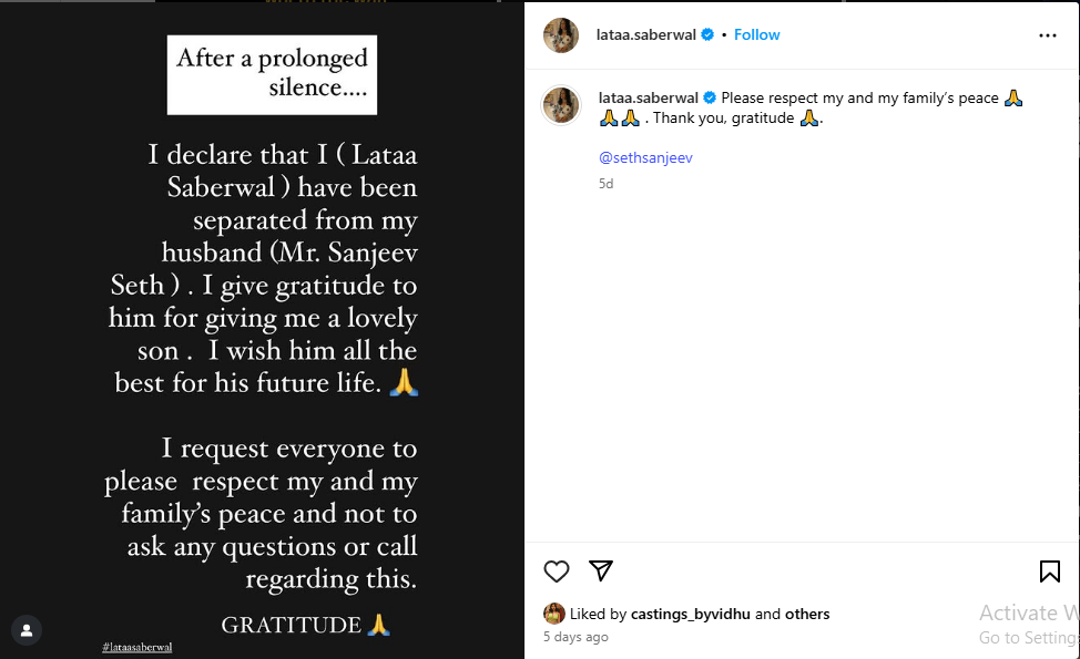 तलाक की घोषणा के अगले ही दिन, 25 जून को Lata Sabrawal ने इंस्टाग्राम पर एक पोस्ट शेयर की थी जिसमें लिखा था, “Sundar chehre dhoondhna aasan hai, lekin sundar dil dhoondhna mushkil hai।” यह संदेश यह दर्शाता है कि वह अपने दर्द को ताकत में बदलने की कोशिश कर रही हैं और सोशल मीडिया के ज़रिए खुद को व्यक्त कर रही हैं।